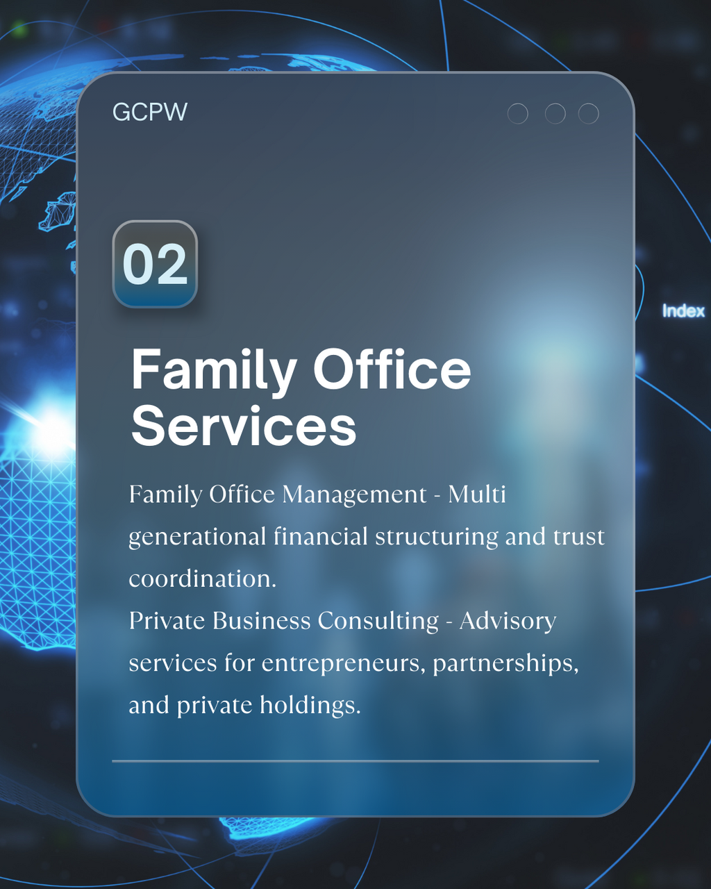 | Family Office Advisory Coordination of investment strategy and professional advisory relationships supporting complex, multi-generational wealth structures. | |